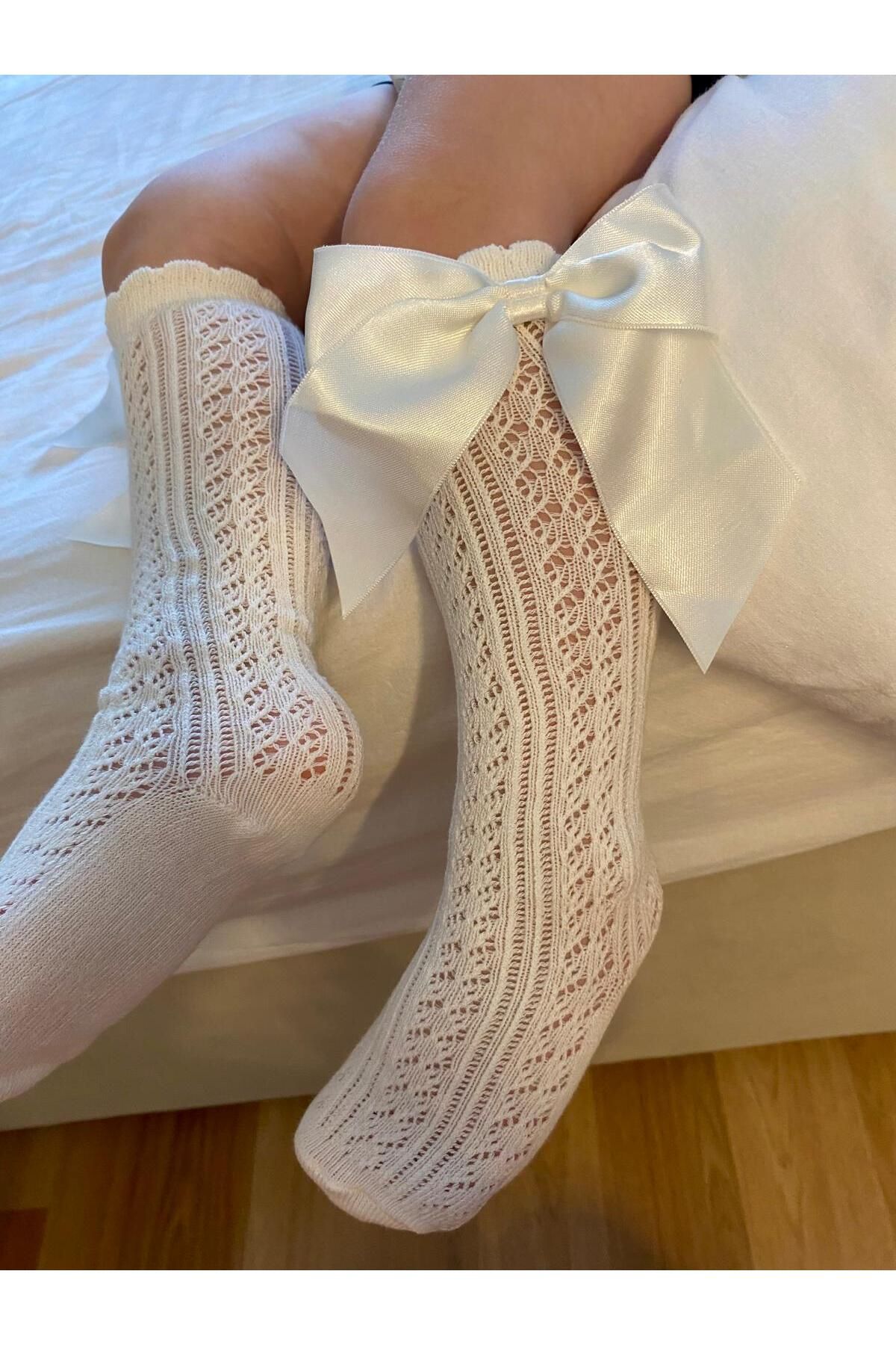 Dizaltı Jakarlı Fiyonklu Pamuklı Çorap Ekru Ekru